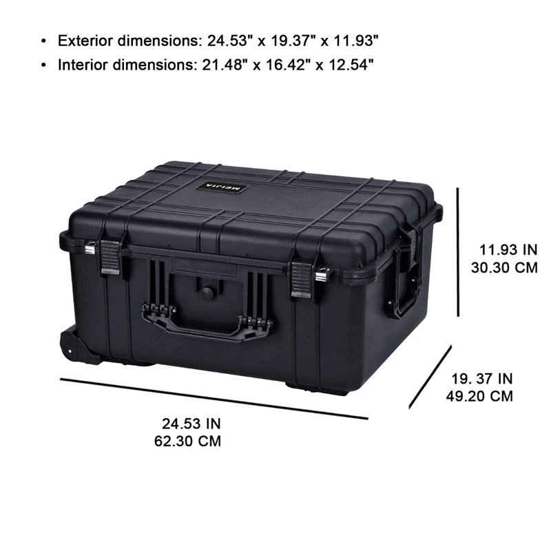 ● Udvendigt dimension: Længde 24.64 tommer bredde 19.39inch højde 13.78 tommer. Indvendigt dimension: Længde 21.48 tommer Bredde 16.42 tommer højde 12.54INCH.LID Dybde: 2.01INCH.BOTTOM Dybde: 10.53INCH.PADLOCK HOLE-DIAMETER: 0.31 tommer. Vægt med skum: 24.62 lbs (11.2 kg) .Multi-industri-applikation under forskellig ved hjælp af betingelser.Keep din værdiablas tør med sin høje performance af. Uanset om du er fanget i regn eller til søs.
